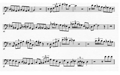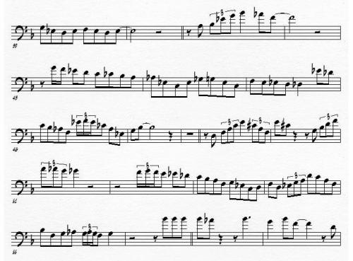 To a jazz trombonist, the preceding excerpt, although playable, doesn’t really lay in an idiomatic fashion on the horn. When a trombone is played in its lower register, all of the slide positions are further apart compared to the closer positions of the higher register. In other words, what Robin meant by “pumpin’ register”, is that the solo is just too damn low and one has to move the slide too much. Bebop is already hard enough on the trombone, and the range that trombonists play Parker’s solos in certainly doesn’t make these tricky solos any easier. Here is what the same excerpt looks like when it’s transposed up a fourth: